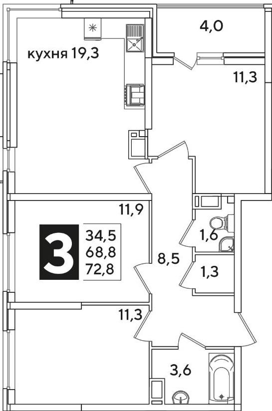 Продается 3-х комн. новостройка, 72.8 кв.м., 11/16 эт