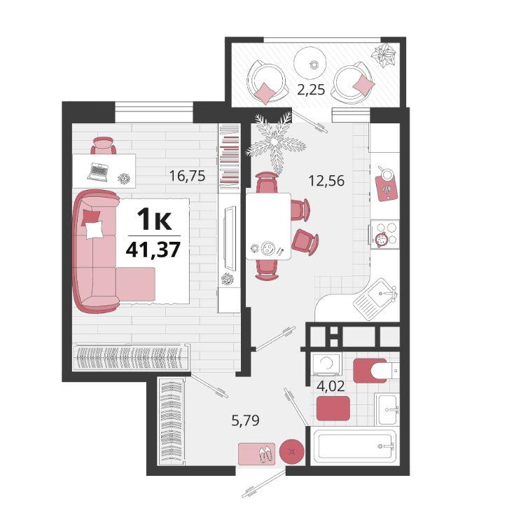 Продается однокомнатная новостройка, 41.3 кв.м., 10/16 эт