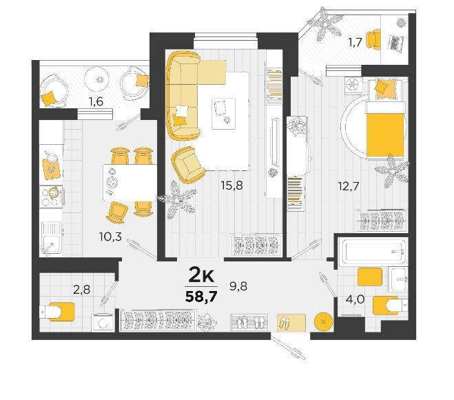 Продается 2-х комн. новостройка, 58.7 кв.м., 12/23 эт
