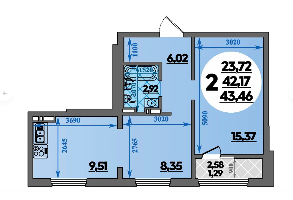 Продается 2-х комн. новостройка, 43.46 кв.м., 7/8 эт