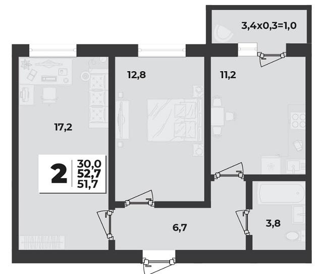 Продается 2-х комн. новостройка, 51.7 кв.м., 3/5 эт