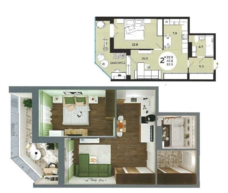 Продается 2-х комн. новостройка, 53.3 кв.м., 7/24 эт