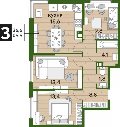Продается 3-х комн. новостройка, 69.9 кв.м., 12/16 эт