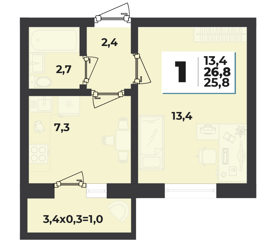 Продается однокомнатная новостройка, 26.3 кв.м., 5/5 эт