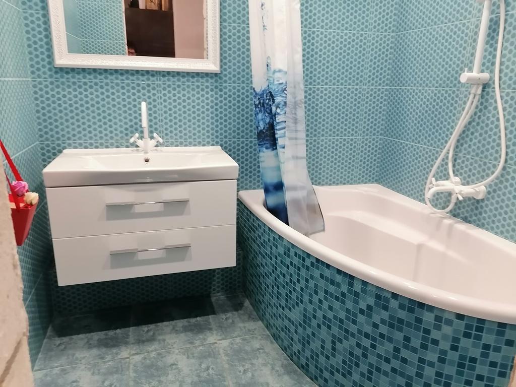 Ванная комната: установлена новая сантехника, качественно уложена плитка, установлена ванна, раковина, подвесная тумба.