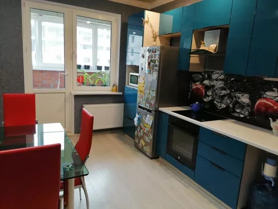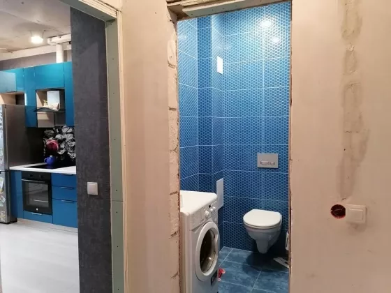 Кухня: штукатурка и шпаклёвка стен, поклейка обоев, уложен ламинат, закреплен багет под натяжной потолок, установлены сафиты , выведены трубы для кондиционер. Выход из кухни на лоджию с видом водвор.