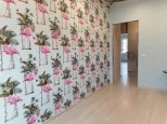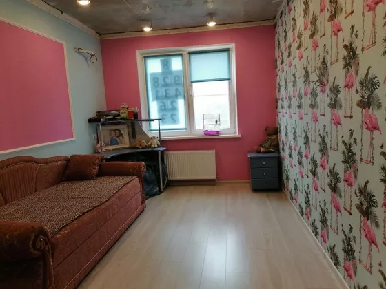 Детская комната: штукатурка и шпаклёвка стен, поклейка обоев, уложен ламинат, закреплен багет под натяжной потолок, сделана трасса под кондиционер (уложены трубы).