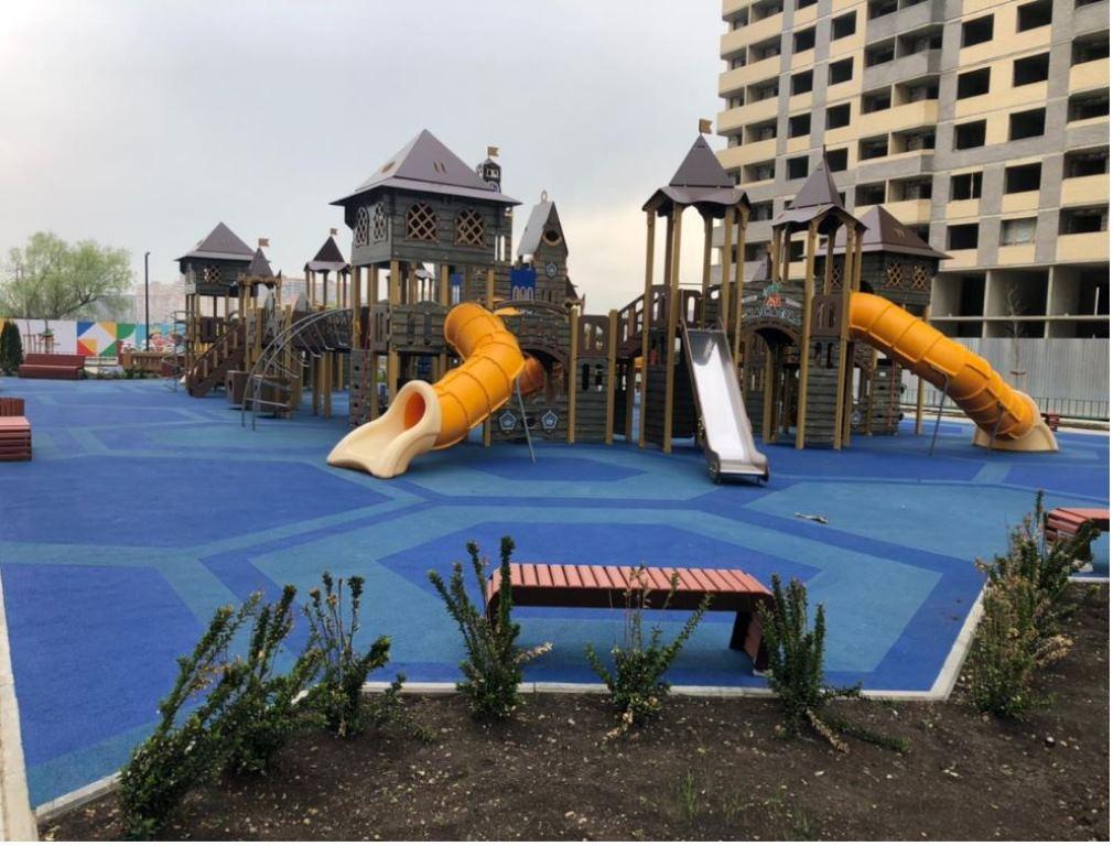 Уютные дворы с удобными скамейками, детские площадки с анти-трамватичным покрытием, детские сады в шаговой доступности зеленые пешеходные дорожки и прогулочные зоны.