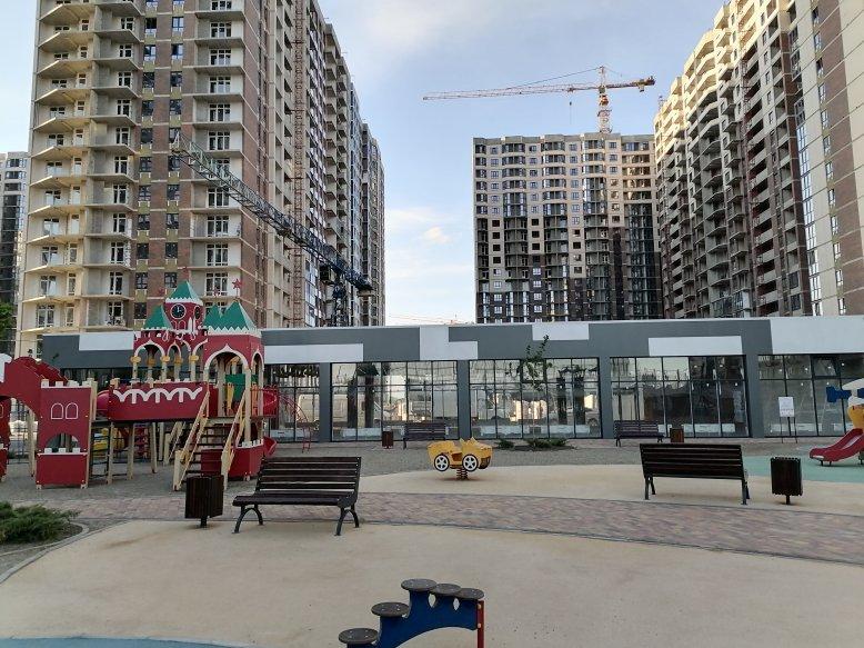 КРАСИВЫЙ СТИЛОБАТ С ДЕТСКИМИ И СПОРТИВНЫМИ ПЛОЩАДКАМИ ДЛЯ ДЕТЕЙ, ПОД СТИЛОБАТОМ ПАРКОВКА ДЛЯ АВТОМОБИЛЕЙ.