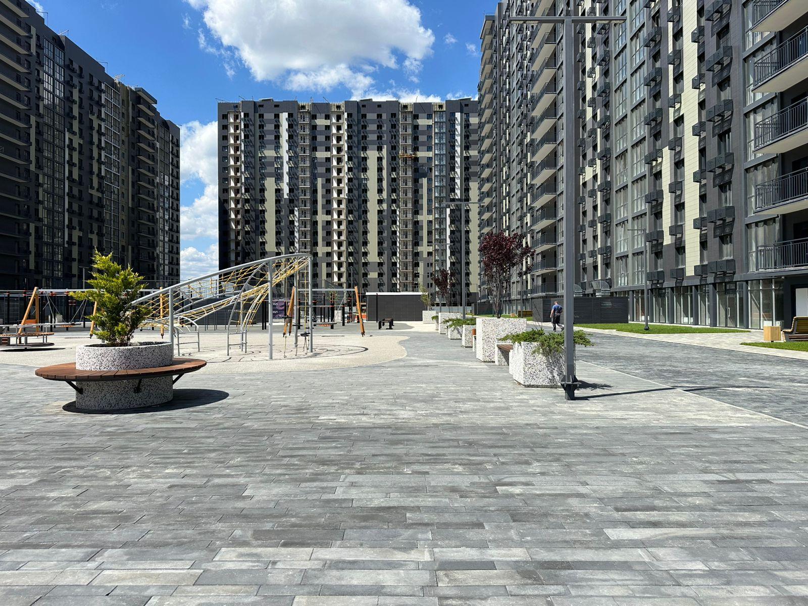 Ландшафтное озеленение, зоны для отдыха, детские и спортивные площадки, скейт-парк, сквер, площадки для питомцев, свой детский сад. Уютные подъезды с колясочными.