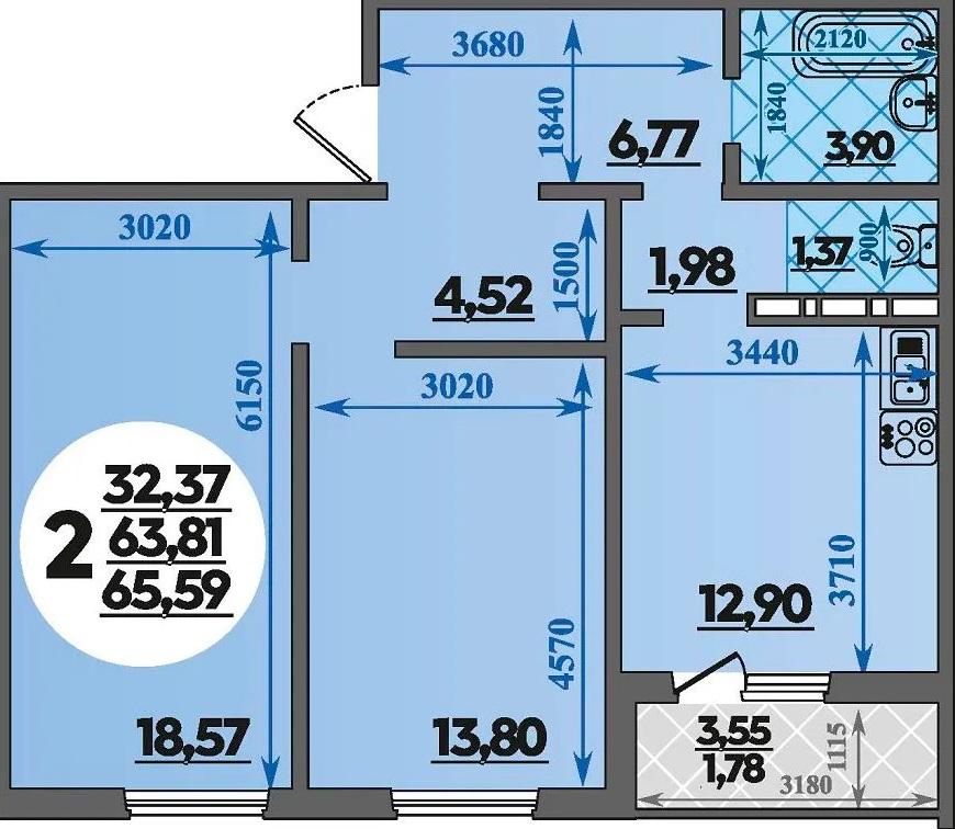 Продается 2-х комн. новостройка, 65.59 кв.м., 2/8 эт