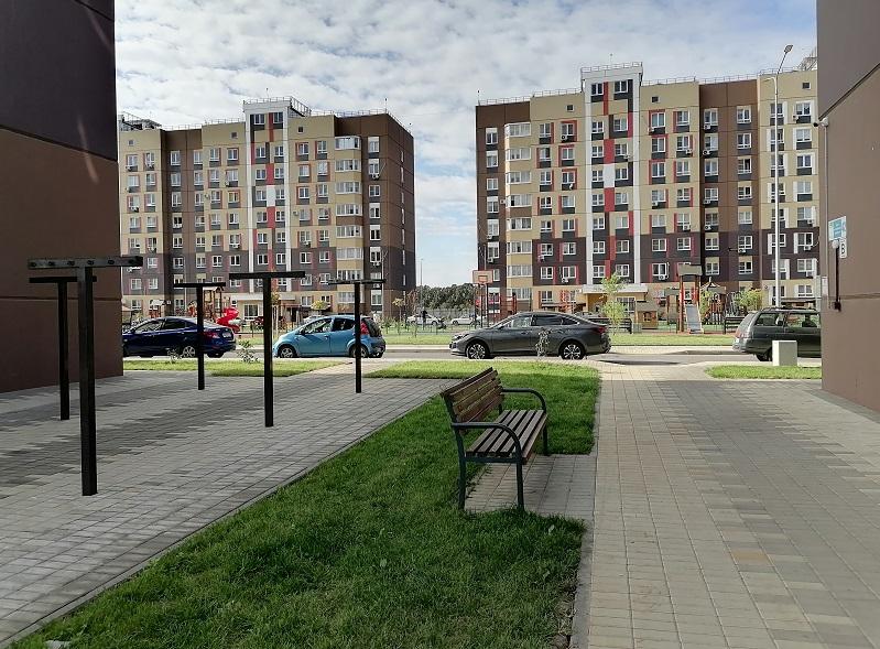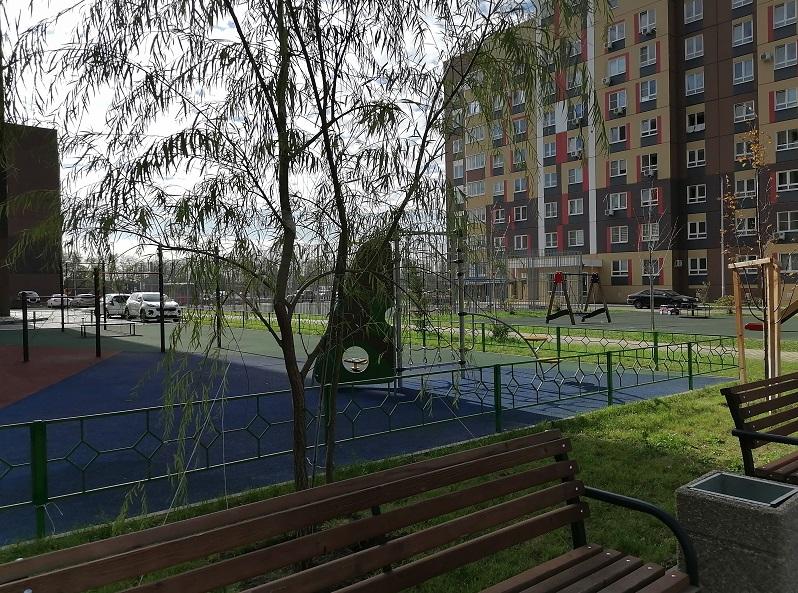 Большое расстояние между домами, много места для парковки автомобилей. Зелёный двор с красочными детскими и спортивными площадками, скамейками для отдыха и красивыми кустарниками , молодыми деревьями.