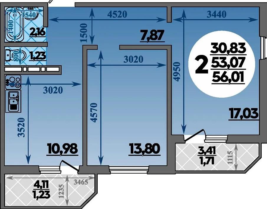 Продается 3-х комн. новостройка, 56.01 кв.м., 7/8 эт
