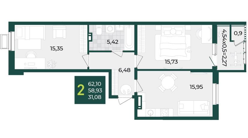 Продается 2-х комн. новостройка, 62.1 кв.м., 10/21 эт