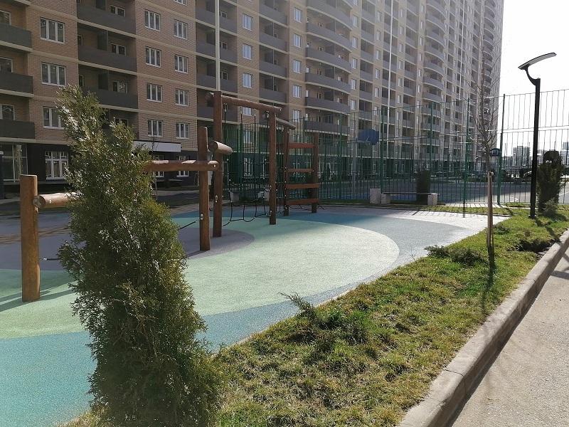 Во дворе детские и спортивные площадки, многоуровневая парковка, детский сад в соседнем дворе, зоны отдыха и своя управляющая компания.