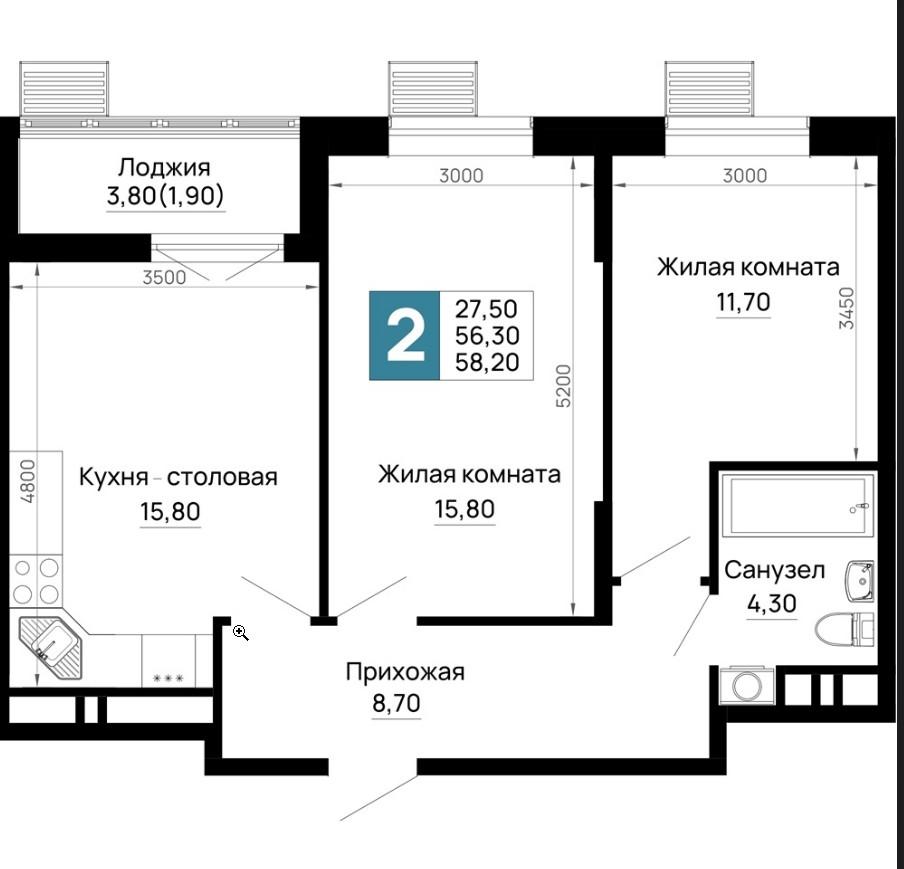 Продается 2-х комн. новостройка, 58.2 кв.м., 3/16 эт