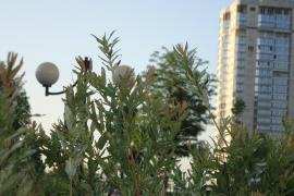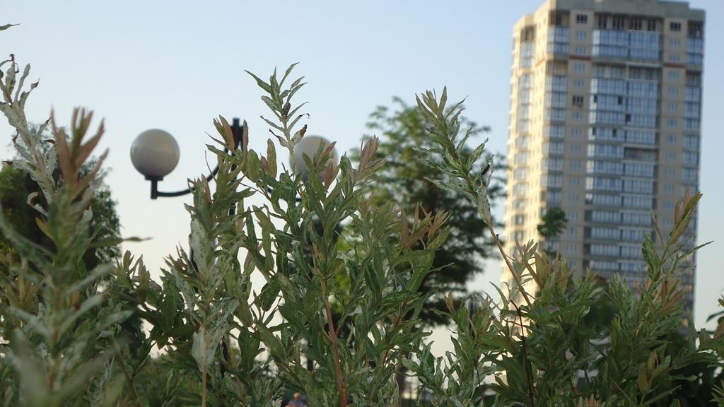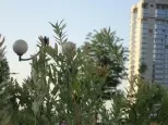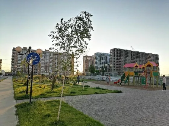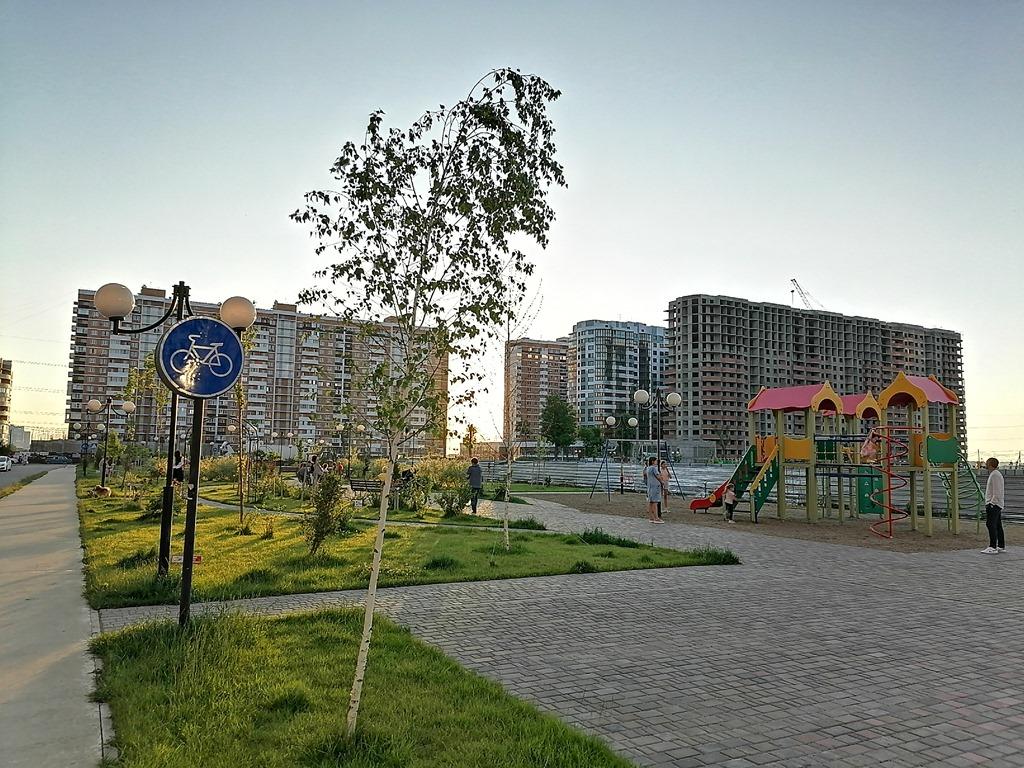 Для прогулок аллея с кустарниками и зеленными деревьями, фонарики, лавочки, велодорожка.