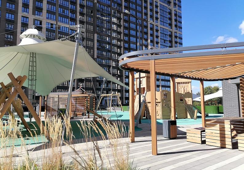 Во дворе-стилобат: 1 уровень - крытый наземный паркинг, а 2 уровень - зоны отдыха и развлечений.