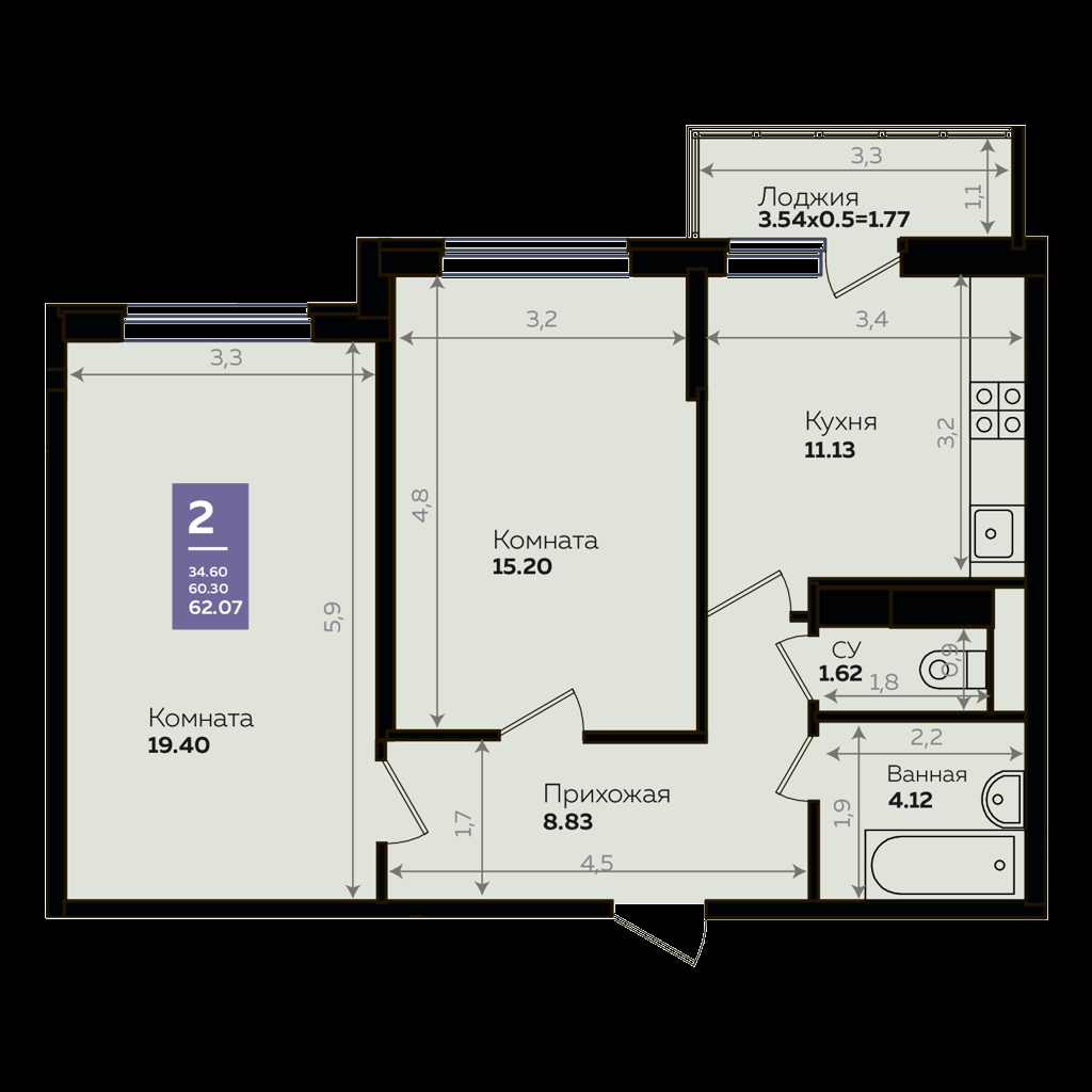 Продается 2-х комн. новостройка, 62.07 кв.м., 12/24 эт