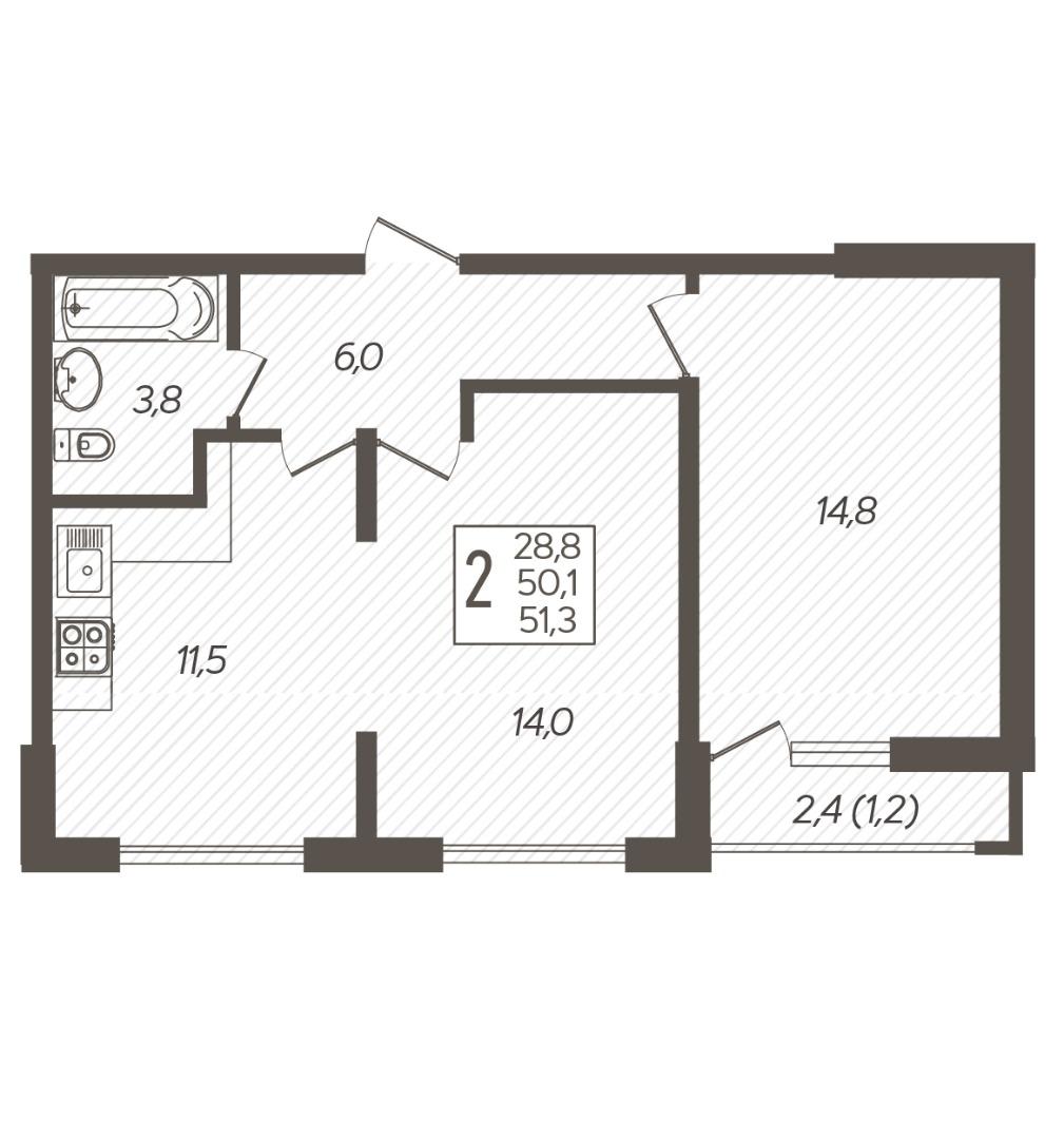 Продается 2-х комн. новостройка, 51.3 кв.м., 3/8 эт