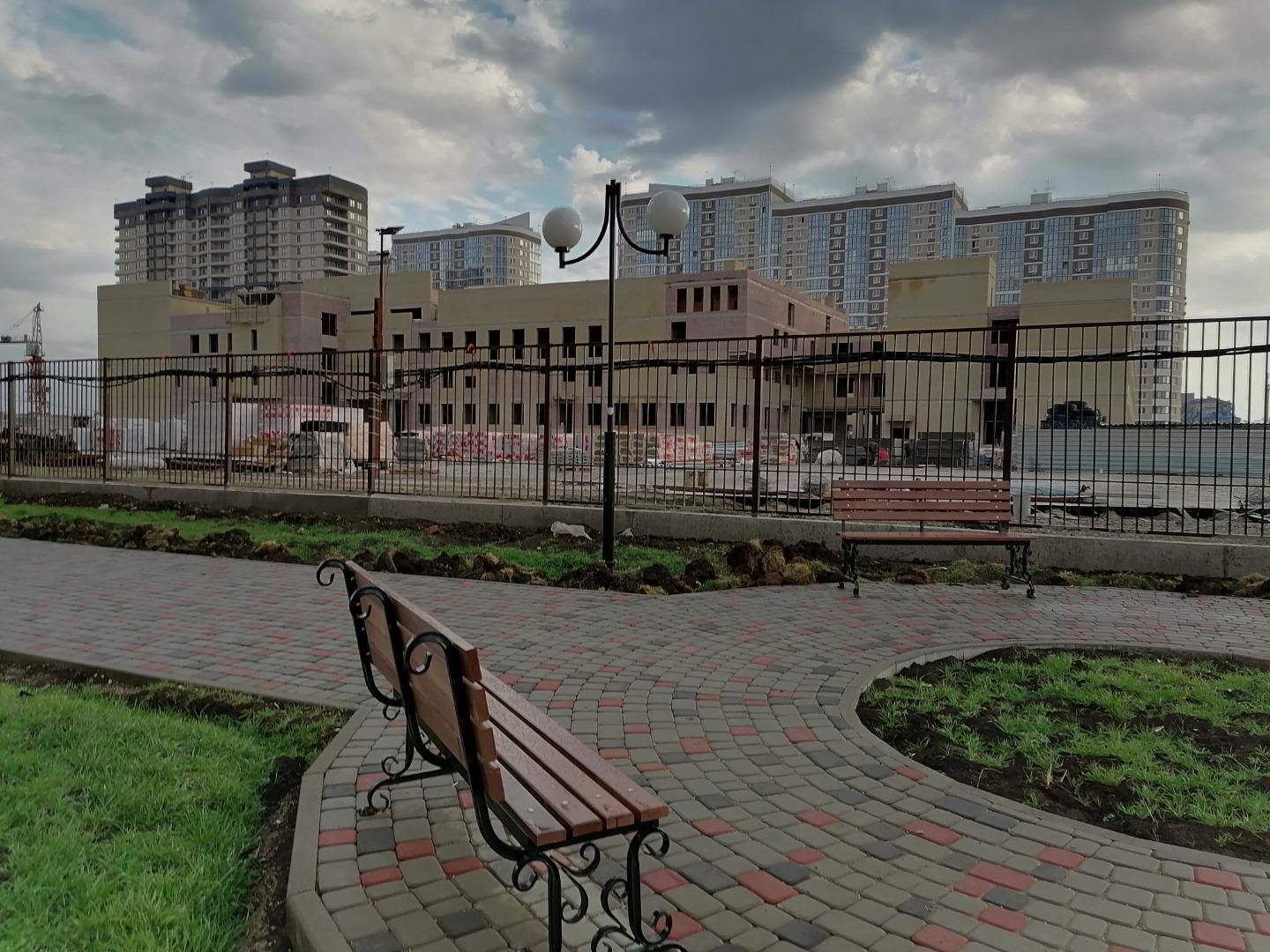 Зеленая парковая зона с ландшафтным дизайном- бульвар им.Адмирала Фёдора Ушакова, вся территория оборудована удобными лавочками, велодорожками и фонтаном.