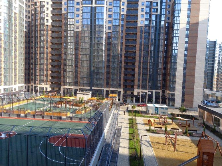 КРАСИВЫЙ СТИЛОБАТ С ДЕТСКИМИ И СПОРТИВНЫМИ ПЛОЩАДКАМИ ДЛЯ ДЕТЕЙ, ПОД СТИЛОБАТОМ ПАРКОВКА ДЛЯ АВТОМОБИЛЕЙ.