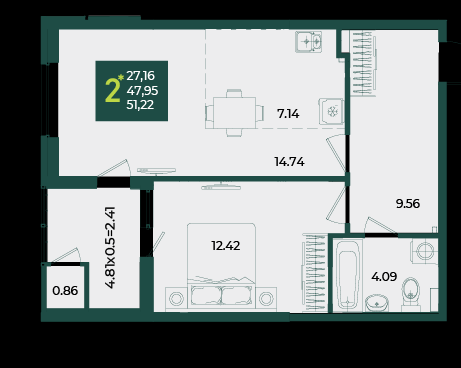 Продается 2-х комн. новостройка, 51.22 кв.м., 2/18 эт