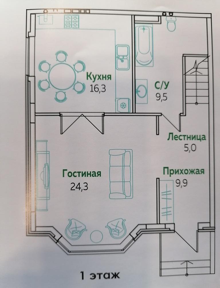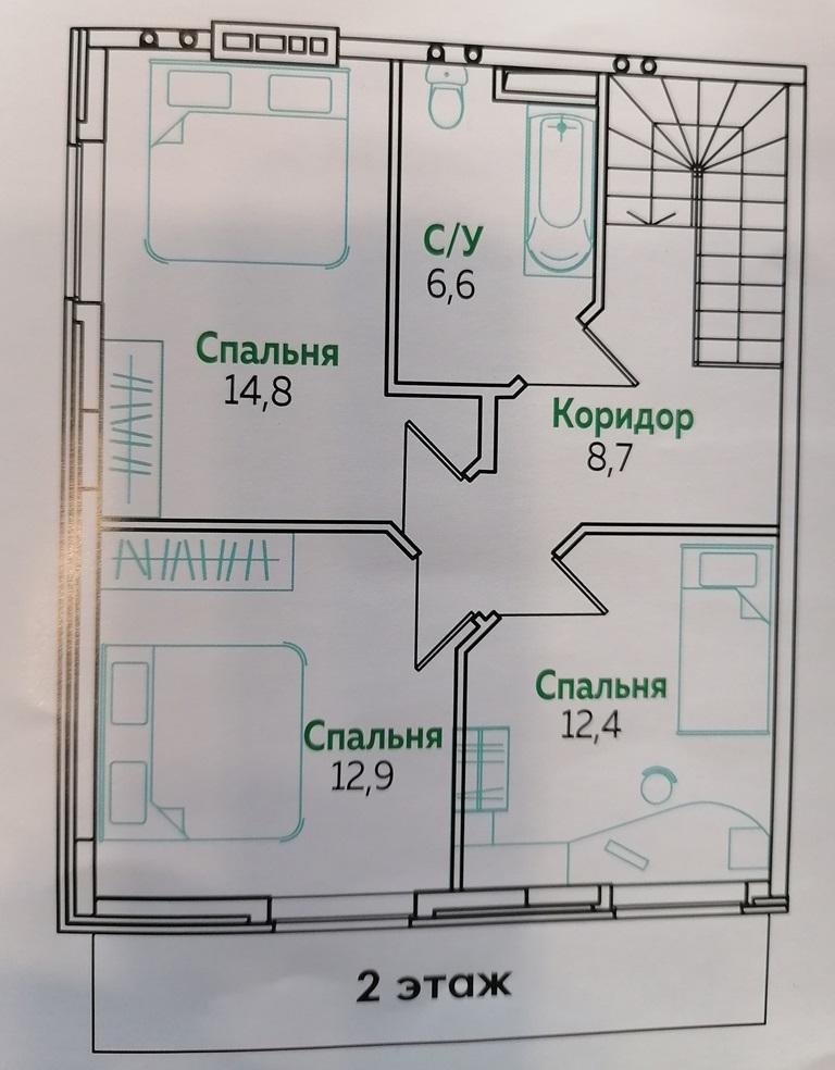 1-й этаж Кухня,Гостинная, 2-й этаж: 3 изолированные спальни, 2с/у, лестница на 2-й этаж монолит., между 2-м этажом и крышей перекрытие монолит- что позволяет сделать мансарду.