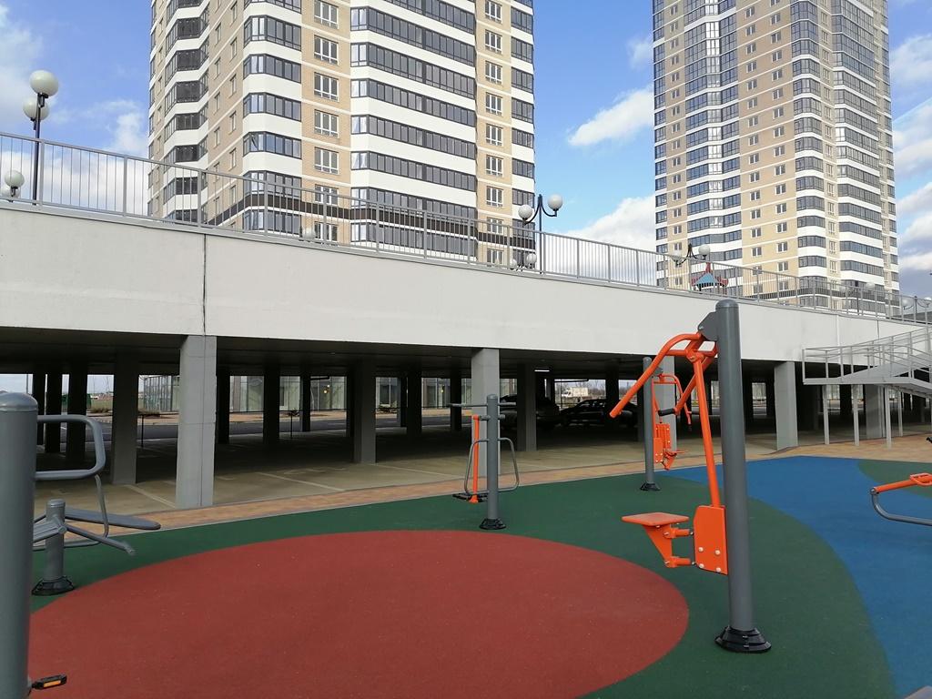 Дизайнерская входная группа, три скоростных лифта, есть консьерж и колясочная зона. Стилобат, с парковкой и большой детской площадкой на которой расположено футбольное и баскетбольное поле, спортивная зона и уютные беседки с мангалом.