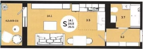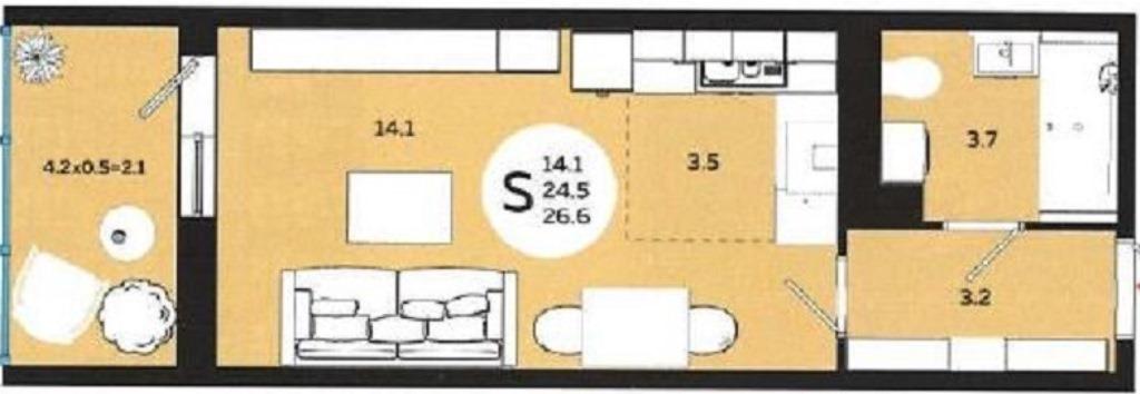 Квартира - студия в доме класса комфорт. Квартира с большой лоджией, где можно организовать дополнительное рабочее время.