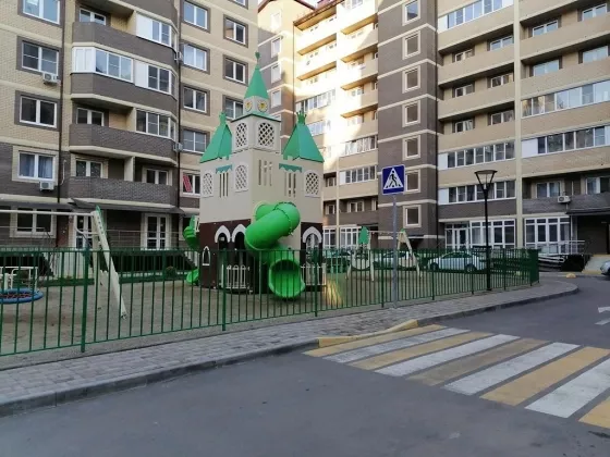Прекрасная придомовая территория, красочно оформлены детские и спортивные площадки, зоны отдыха для детей и взрослых. Открыты магазины и объекты бытового обслуживания, первые этажи дома отведены под коммерцию, поэтому у вас всё необходимое в доме есть. Везде уложена красивая тротуарная плитка, всё чисто и аккуратно. При въезде в жилищный комплекс арка с часами, а чуть правее зеленая аллея со скамейками для отдыха, очень красиво. Приезжайте на осмотр убедитесь сами!!!