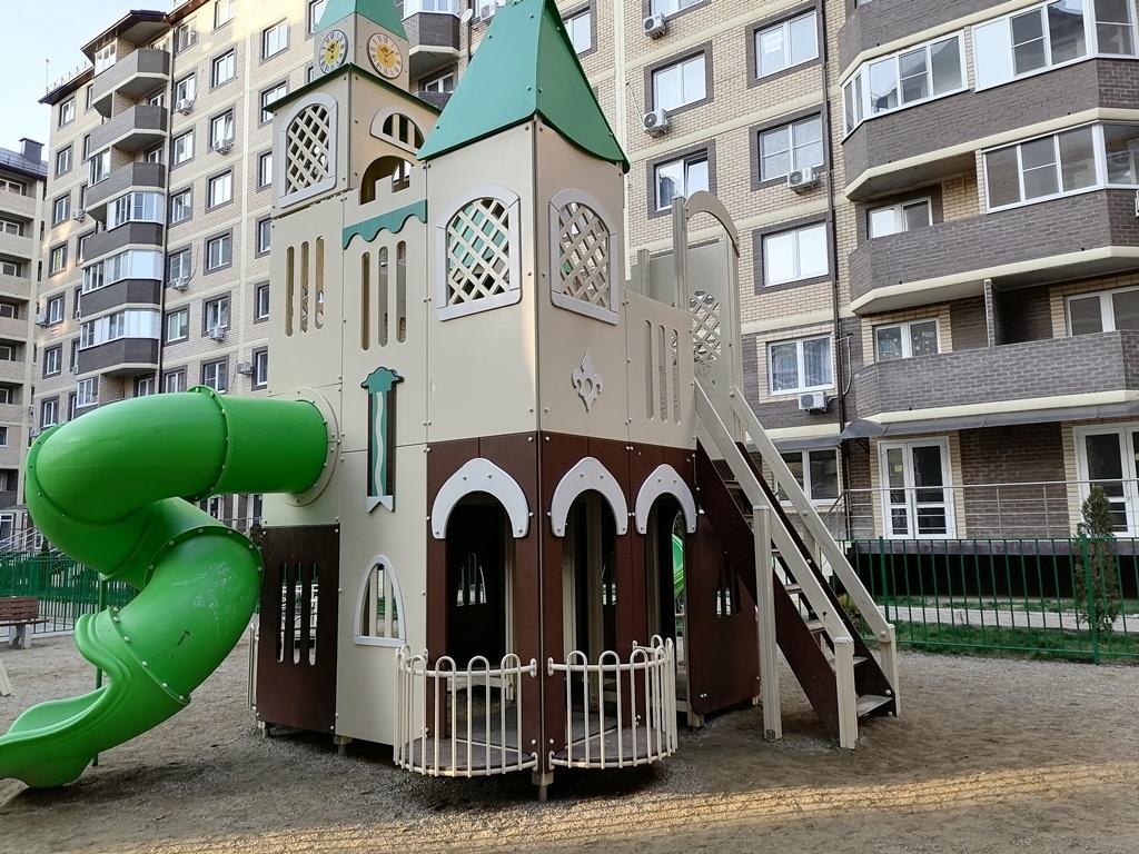Прекрасная придомовая территория, красочно оформлены детские и спортивные площадки , зоны отдыха для детей и взрослых. Открыты магазины и объекты бытового обслуживания, первые этажи дома отведены под коммерцию, поэтому у вас всё необходимое в доме есть. Везде уложена красивая тротуарная плитка, всё чисто и аккуратно. При въезде в жилищный комплекс арка с часами, а чуть правее зеленая аллея со скамейками для отдыха, очень красиво. Чистота и порядок!!!