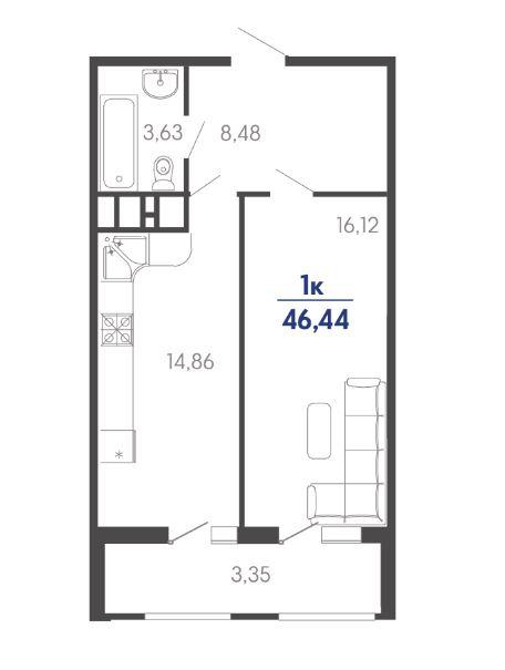 Продается однокомнатная новостройка, 46.44 кв.м., 13/16 эт
