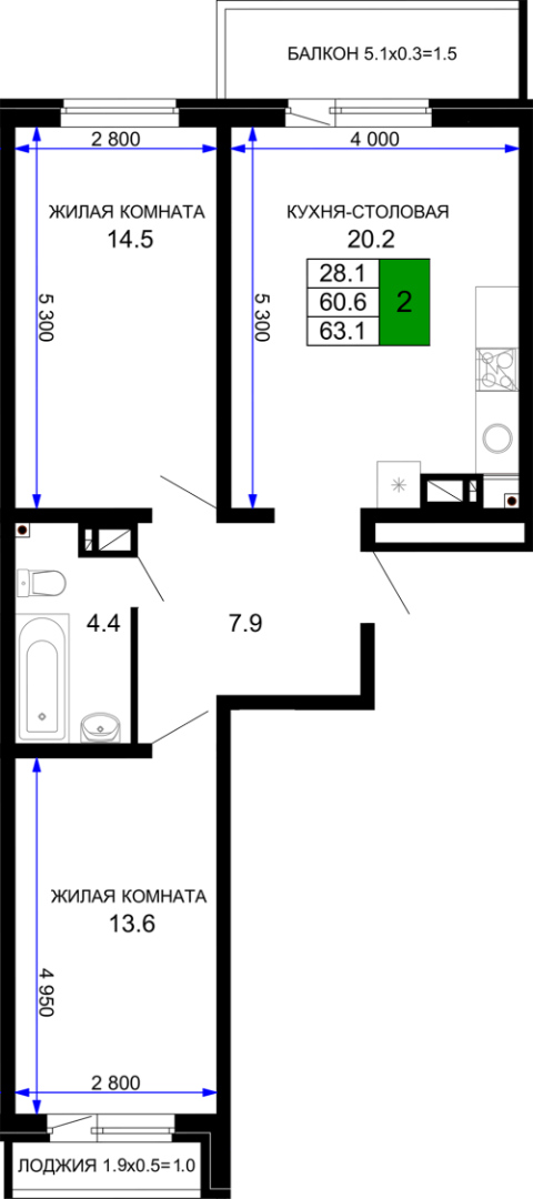 Продается 2-х комн. новостройка, 61.3 кв.м., 9/16 эт
