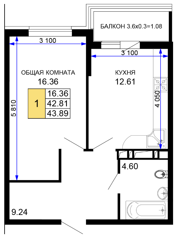 Продается однокомнатная новостройка, 44 кв.м., 13/15 эт