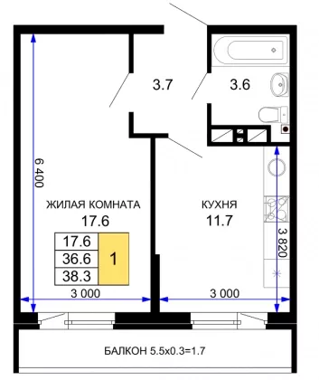 Продается однокомнатная новостройка, 38.3 кв.м., 14/16 эт