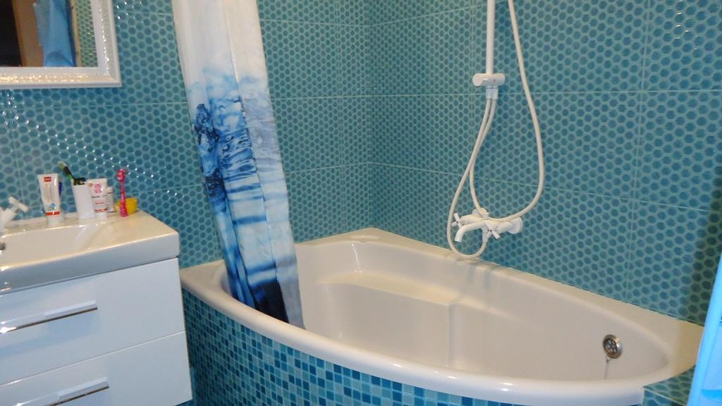 В ванной комнате установлена инсталяция, ванна, раковина и навесная тумба, качественно уложена плитка.