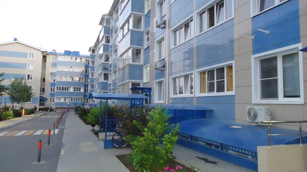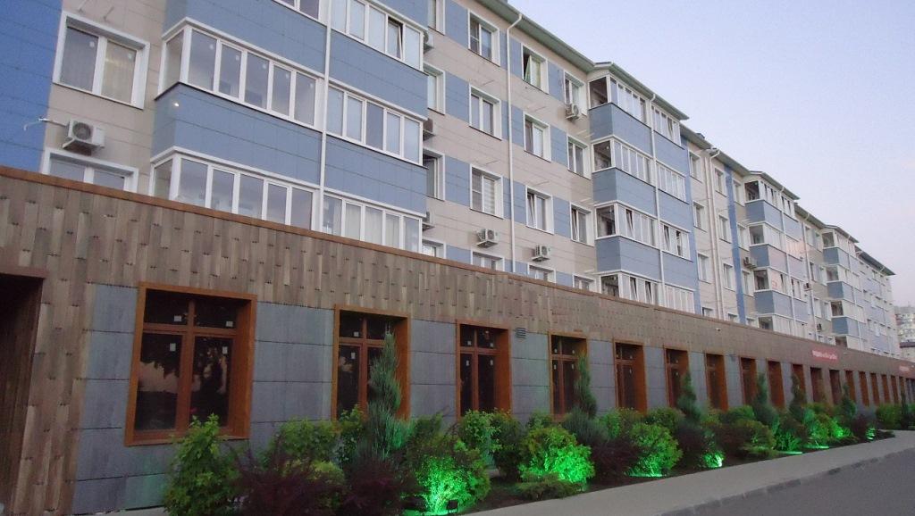 Красивые дома, в ночное время с цветными подсветками. Чистый двор без машин, так как парковка вынесена за территорию двора (перед домами сделана огромная парковка для автомобилей).