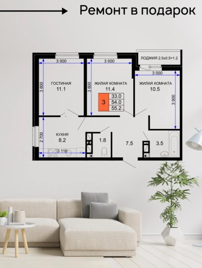 Продается 3-х комн. новостройка, 56 кв.м., 6/16 эт