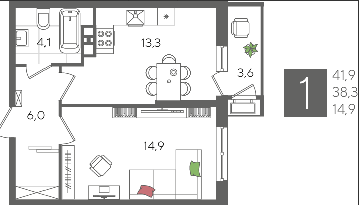 Продается однокомнатная новостройка, 41.9 кв.м., 11/24 эт
