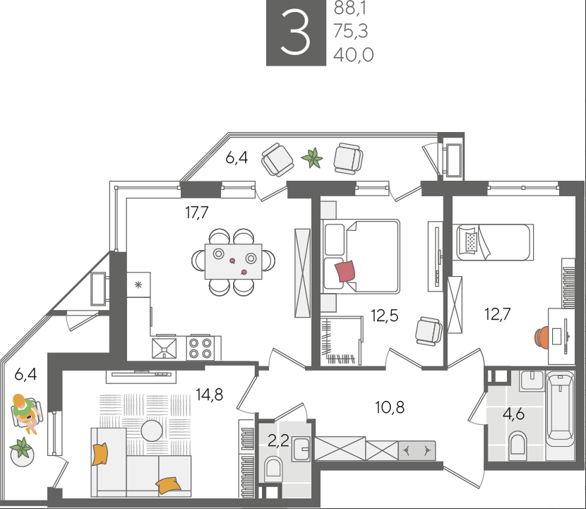 Продается 3-х комн. новостройка, 88.1 кв.м., 17/24 эт