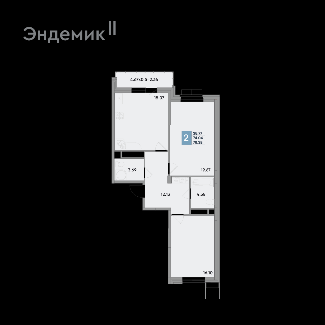 Продается 2-х комн. новостройка, 77 кв.м., 9/10 эт