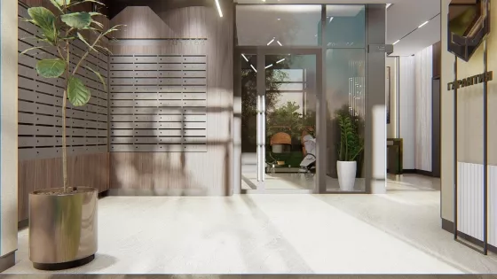Дизайнерские входные группы, с современными лифтами, на первом этаже колясочные, веллопарковки.