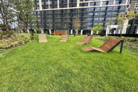 Ландшафтный дизайн всего комплекса, современные детские площадки с тематическими Арт-объектами и фонтаном, прогулочные зоны, футбольная и волейбольные площадки.