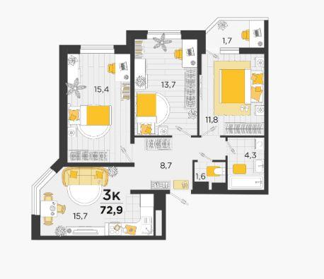 Продается 3-х комн. новостройка, 72.9 кв.м., 9/40.9 эт