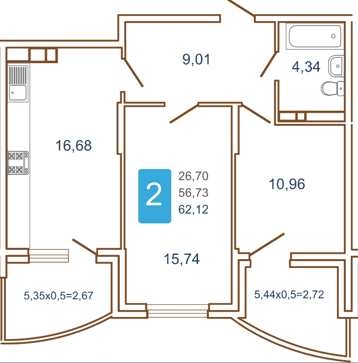 Продается 2-х комн. новостройка, 62.12 кв.м., 10/16 эт