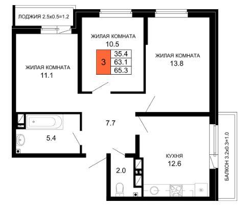 Продается 3-х комн. новостройка, 65.3 кв.м., 10/16 эт