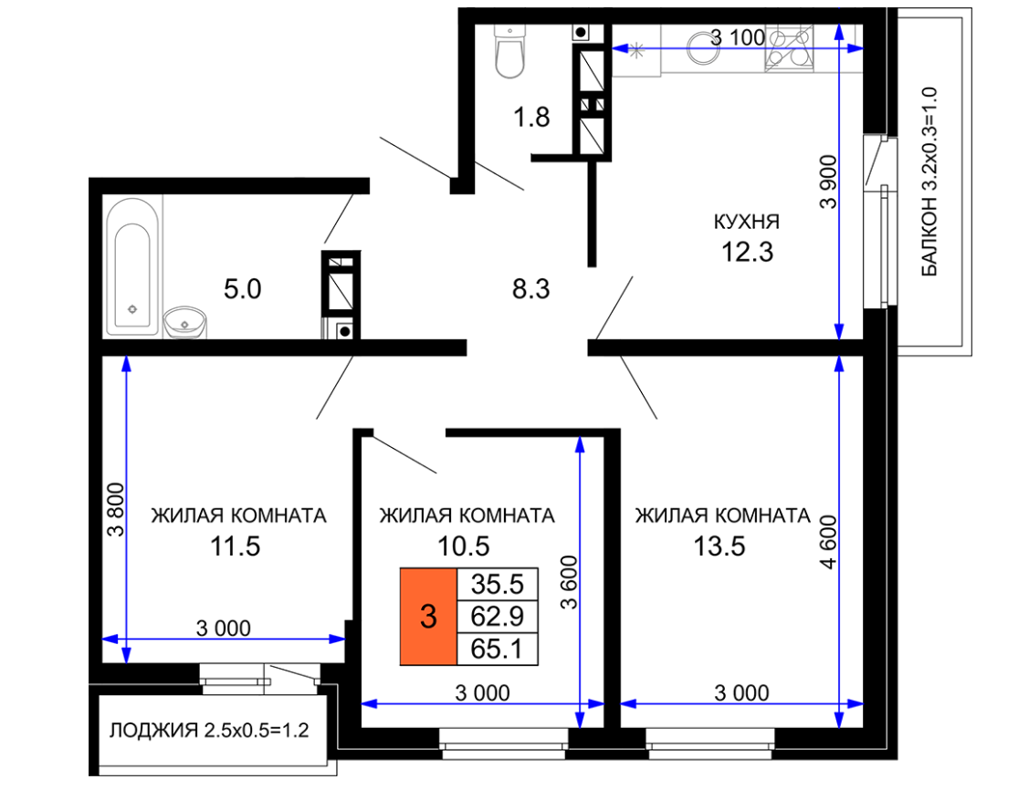 Продается 3-х комн. новостройка, 65.1 кв.м., 11/16 эт
