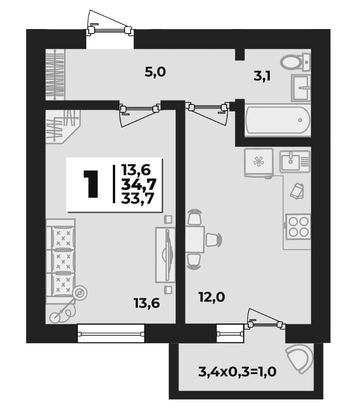 Продается однокомнатная новостройка, 31 кв.м., 1/5 эт
