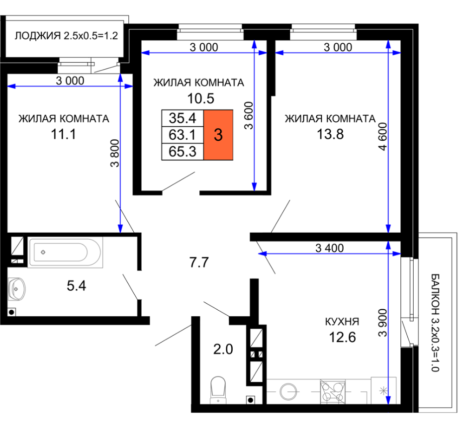 Продается 3-х комн. новостройка, 65.3 кв.м., 12/16 эт